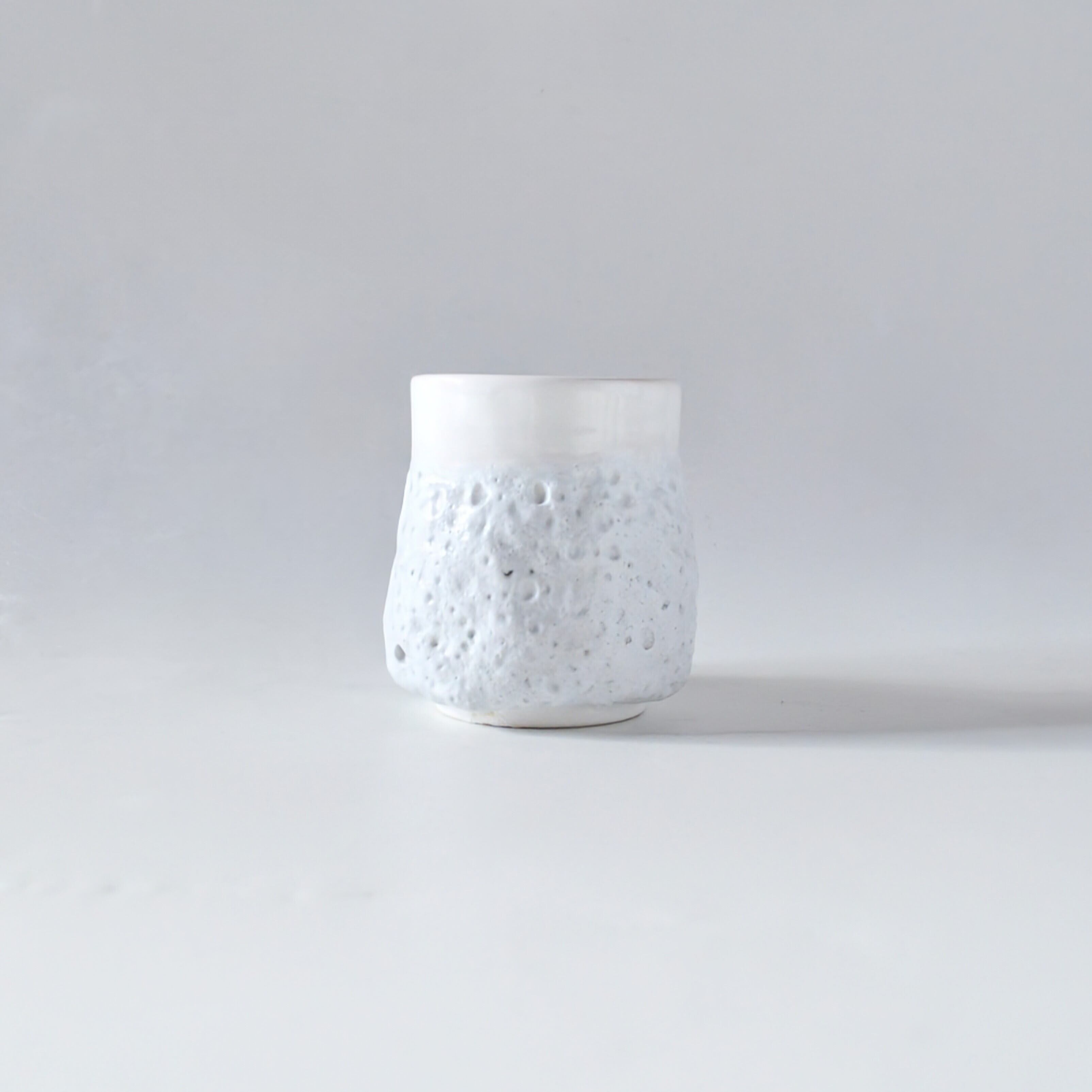 『FORM CUP』は一般的に見られる湯呑みの形状のまわりに焼成すると発泡する特殊な釉薬を施すことでぼこぼこと泡の凹凸が生まれ、そのまま固めることで異なる表情を楽しめるカップ。