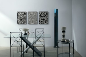 創業140年の日本を代表するテキスタイルデザインカンパニー〈fujie textile〉とグラフィックデザイナーの小林一毅さんの協業によって2025年に発表されたテキスタイルアートコレクション『Between black & white』。
