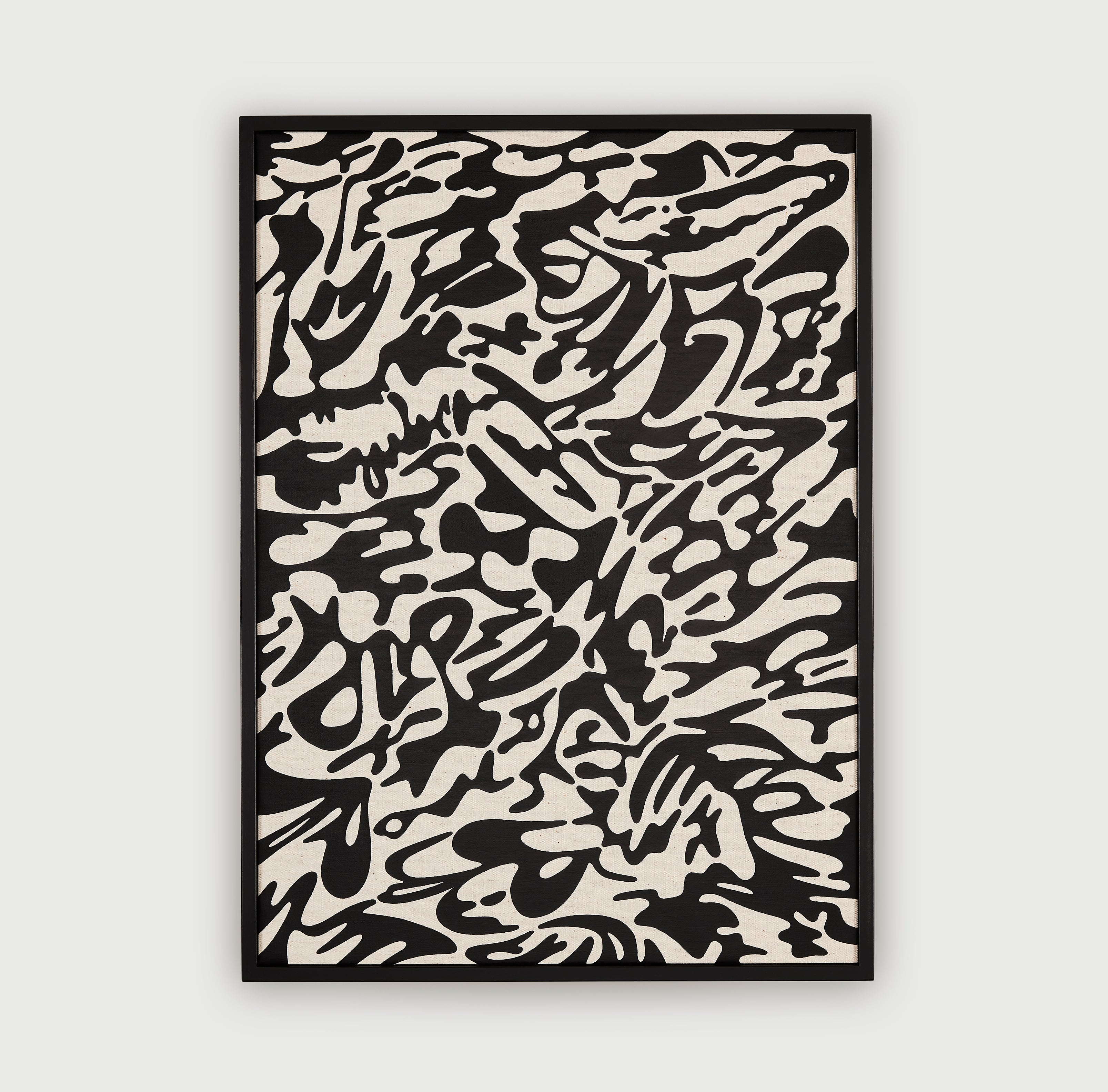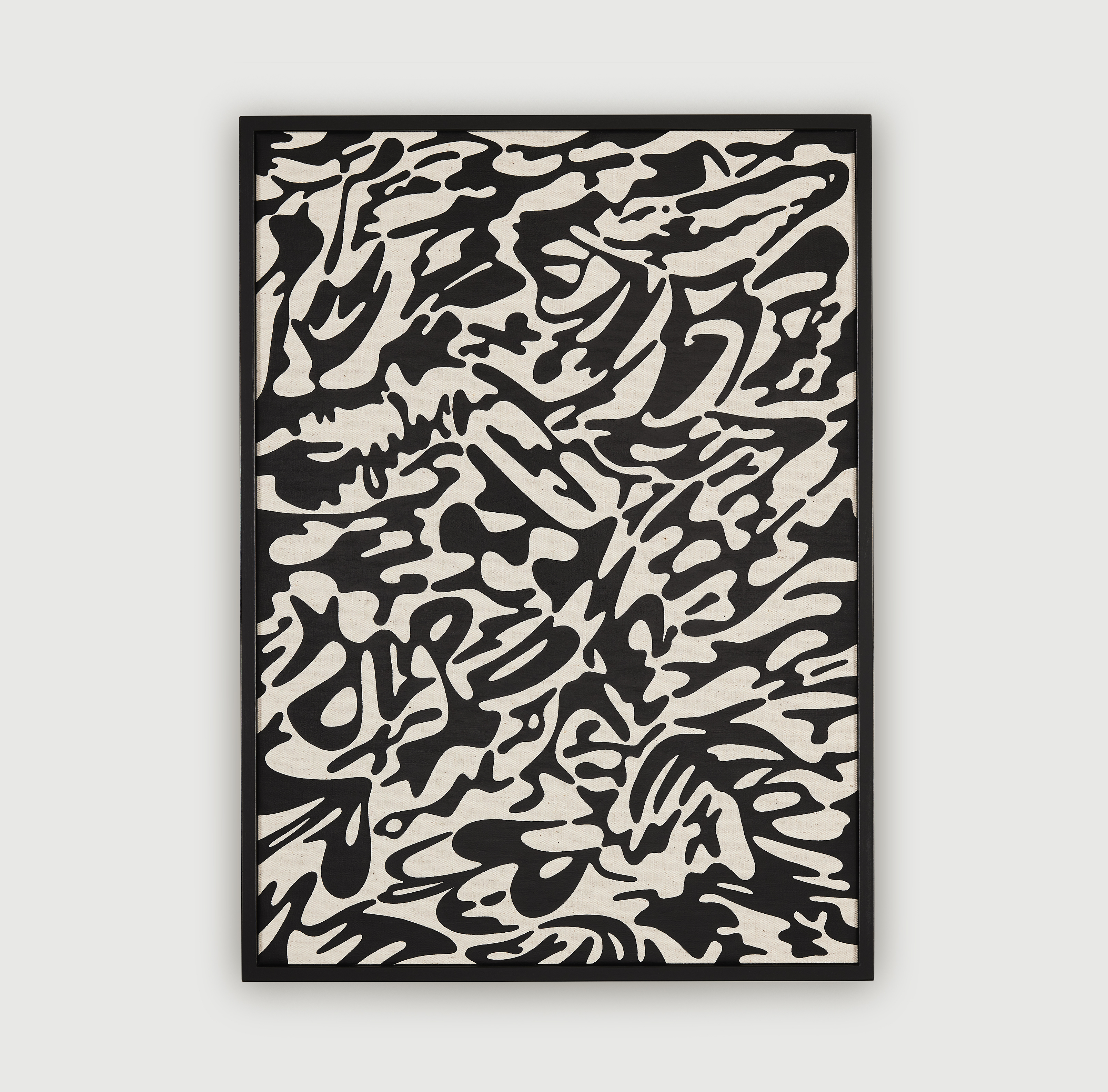 創業140年の日本を代表するテキスタイルデザインカンパニー〈fujie textile〉とグラフィックデザイナーの小林一毅さんの協業によって2025年に発表されたテキスタイルアートコレクション『Between black & white』。