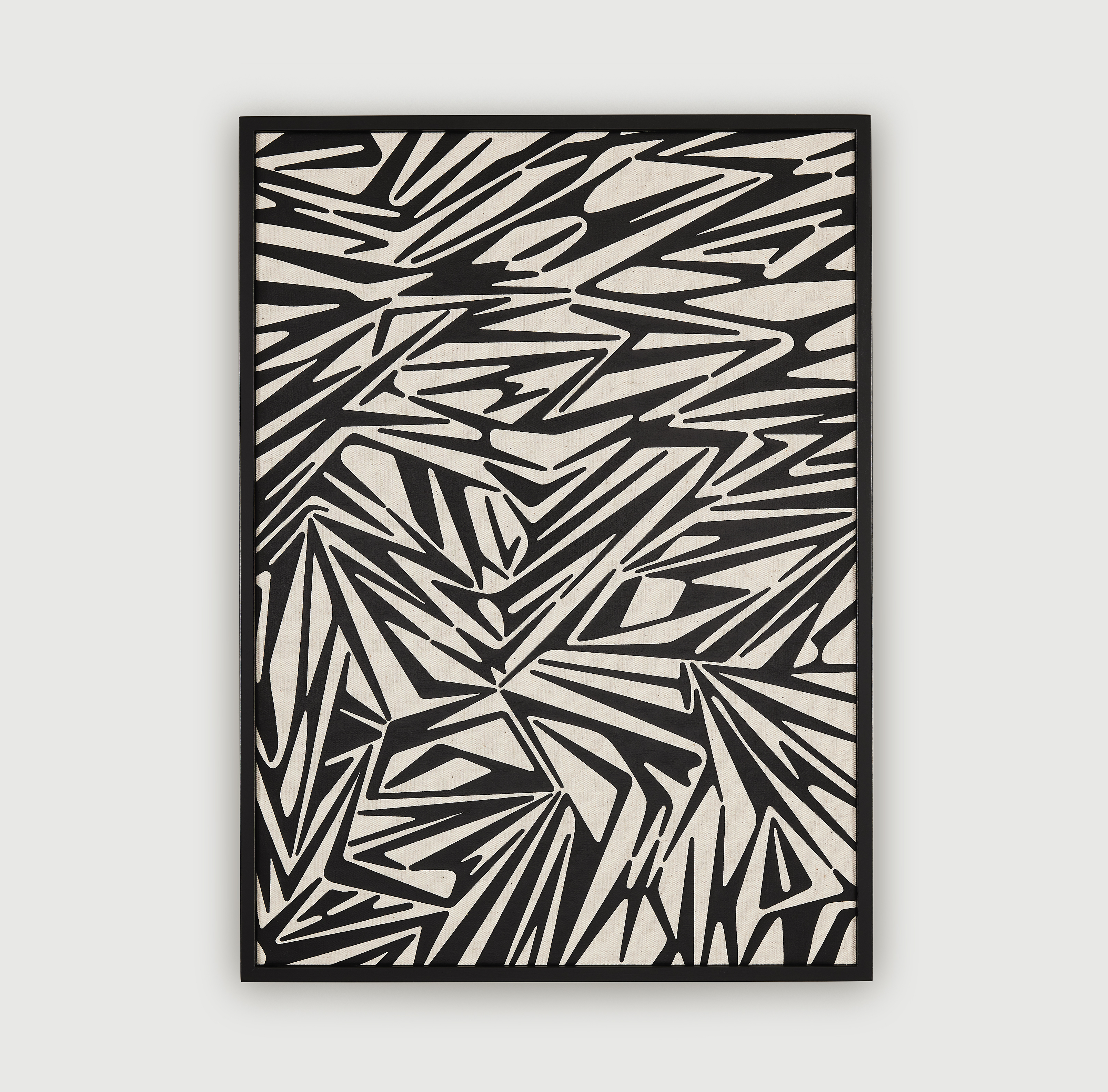 紙ではなく、綿麻の風合いが感じられるテキスタイルに図案を写すことで、シャープなモノトーンの印象に暖かみが感じられる仕上がりに。
