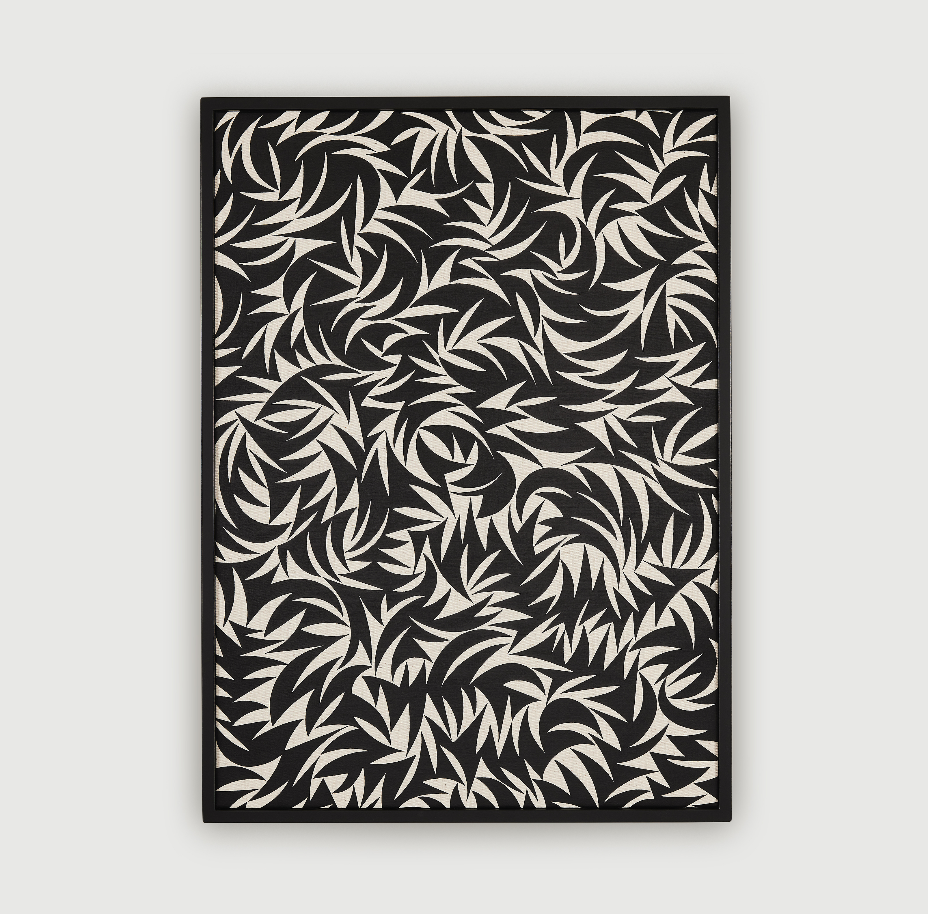 創業140年の日本を代表するテキスタイルデザインカンパニー〈fujie textile〉とグラフィックデザイナーの小林一毅さんの協業によって2025年に発表されたテキスタイルアートコレクション『Between black & white』。