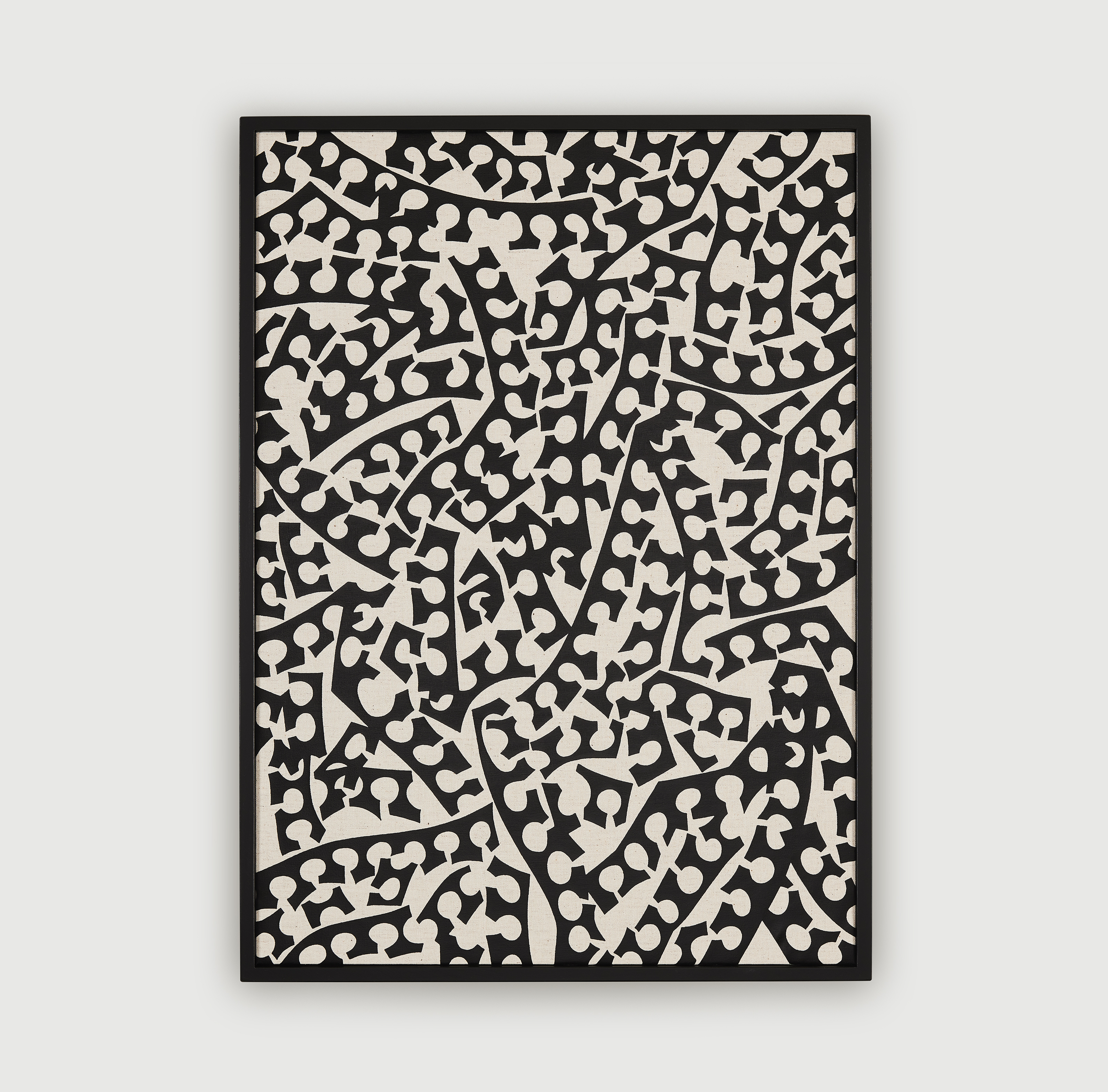 紙ではなく、綿麻の風合いが感じられるテキスタイルに図案を写すことで、シャープなモノトーンの印象に暖かみが感じられる仕上がりに。