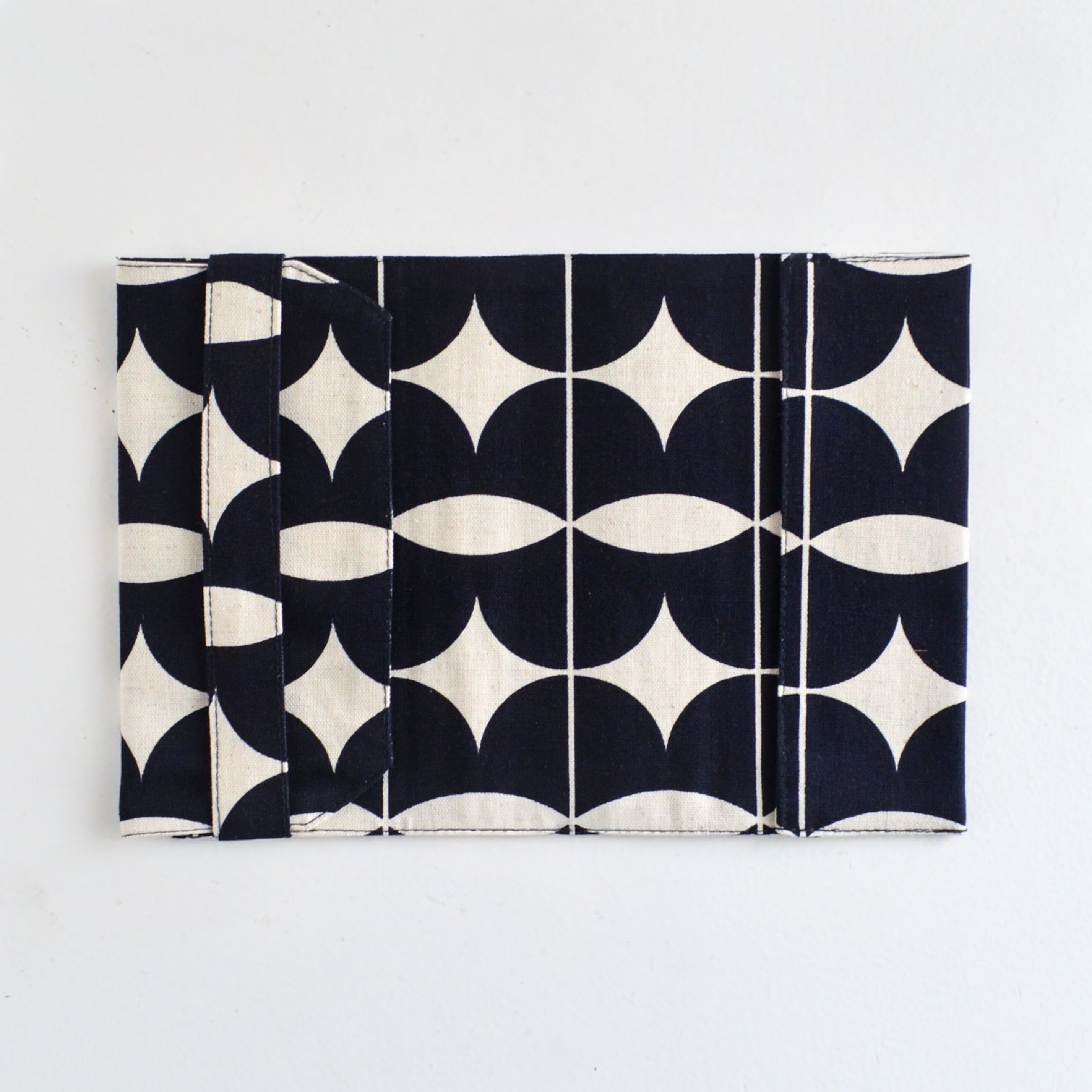 表紙をテキスタイルで挟み込むように遣い、本の厚みに合わせて背表紙側で調整するような使い方です。