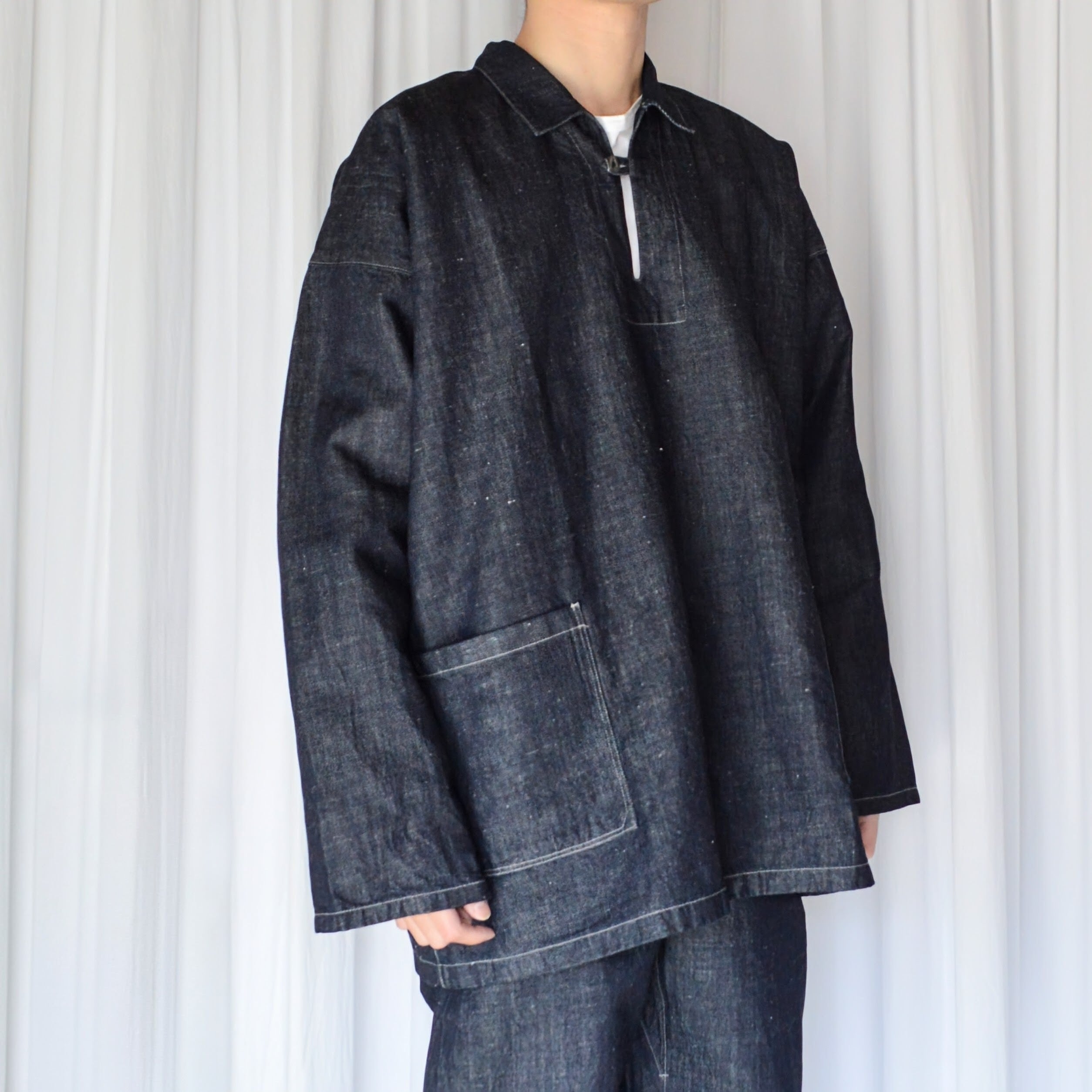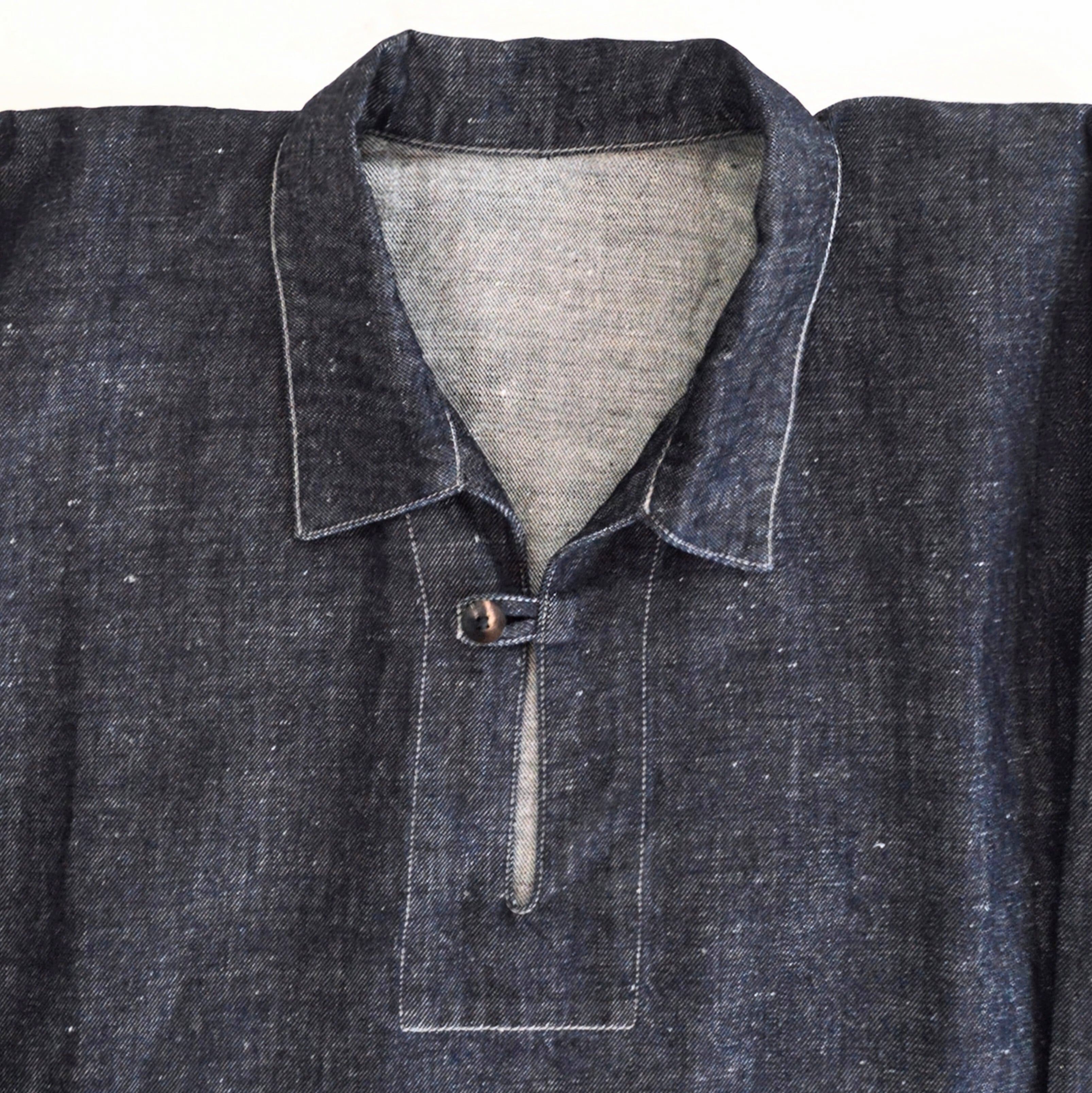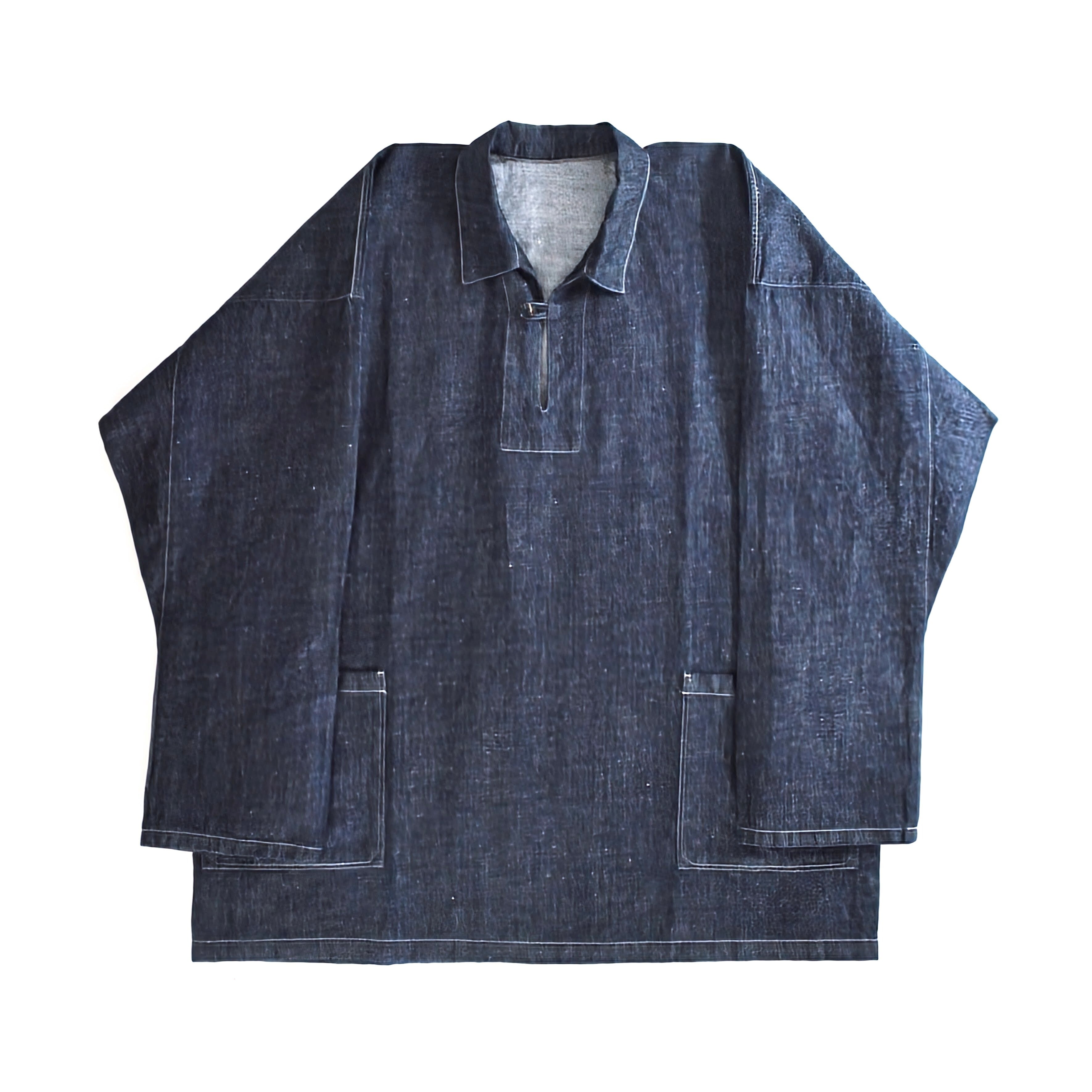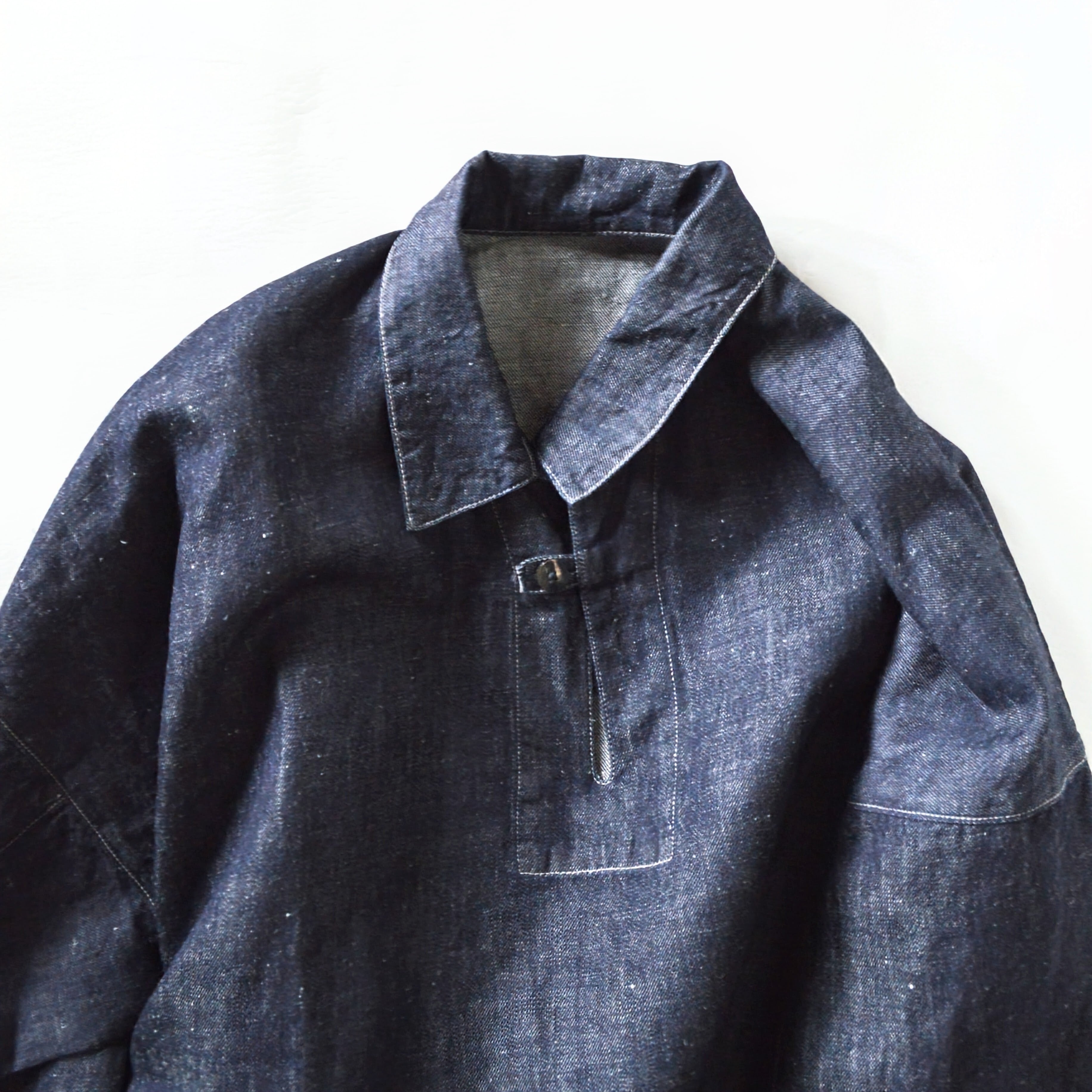 既存のファッション産業への疑問から、服づくりに携わるすべての人が健全に継続できるものづくりを目指し、独自の取り組みを行いながら衣服やそれにまつわる経済の循環を確立している稀有なブランド〈MITTAN〉が、岡山県井原市で織り上げたオリジナルのデニム生地を使用したプルオーバー。
