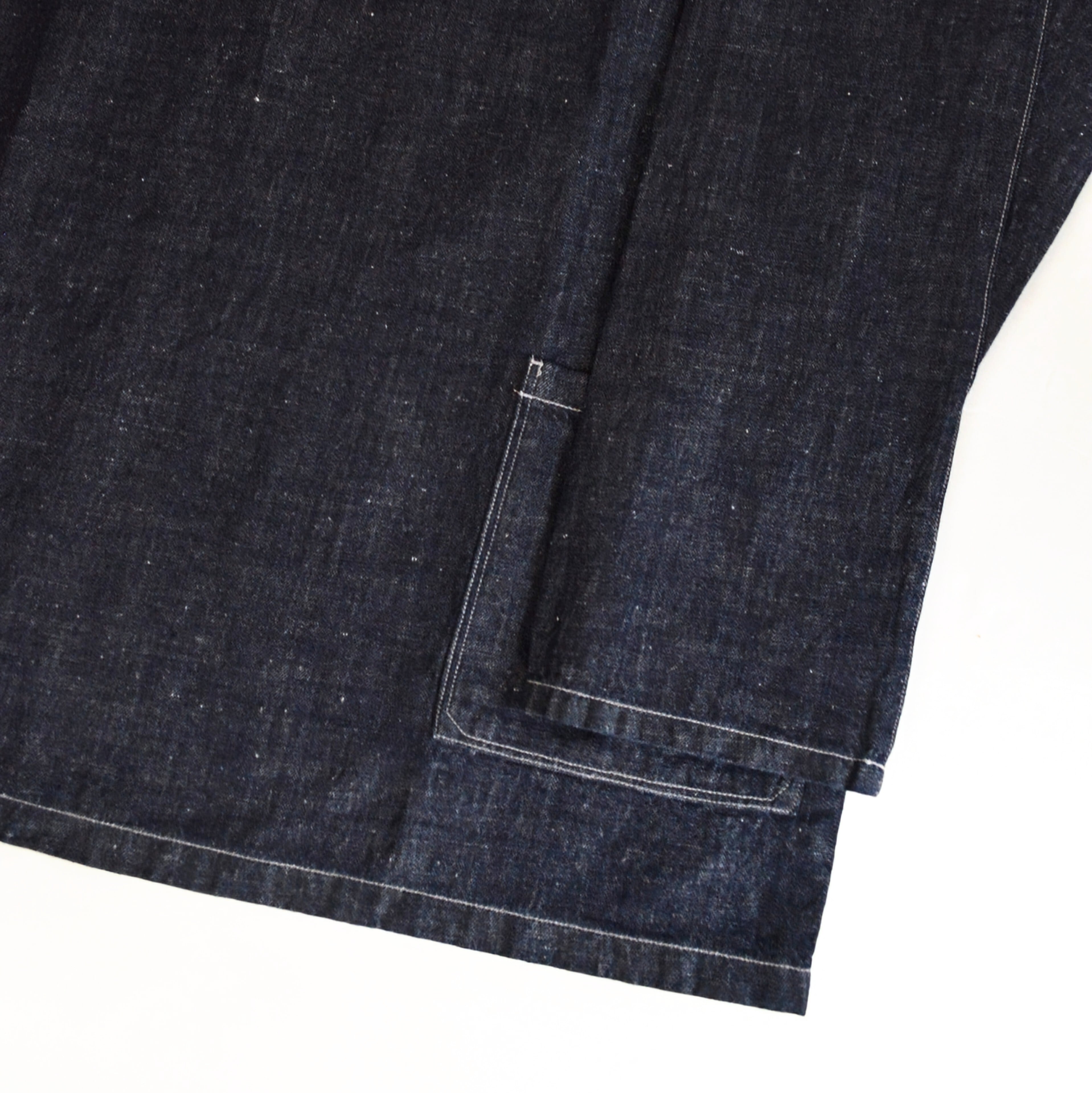 経糸にはオーガニックコットンを使用し、ロープ染色によって表面のみをインディゴで染め、糸の芯を白く残しています。緯糸には大麻を用いており、穿き込むほどにインディゴの色が薄く変化し、大麻も強度を保ちながら綿のようにしなやかに変化していきますので、長い時間をかけて風合いが深まっていく様子を楽しめる生地です。