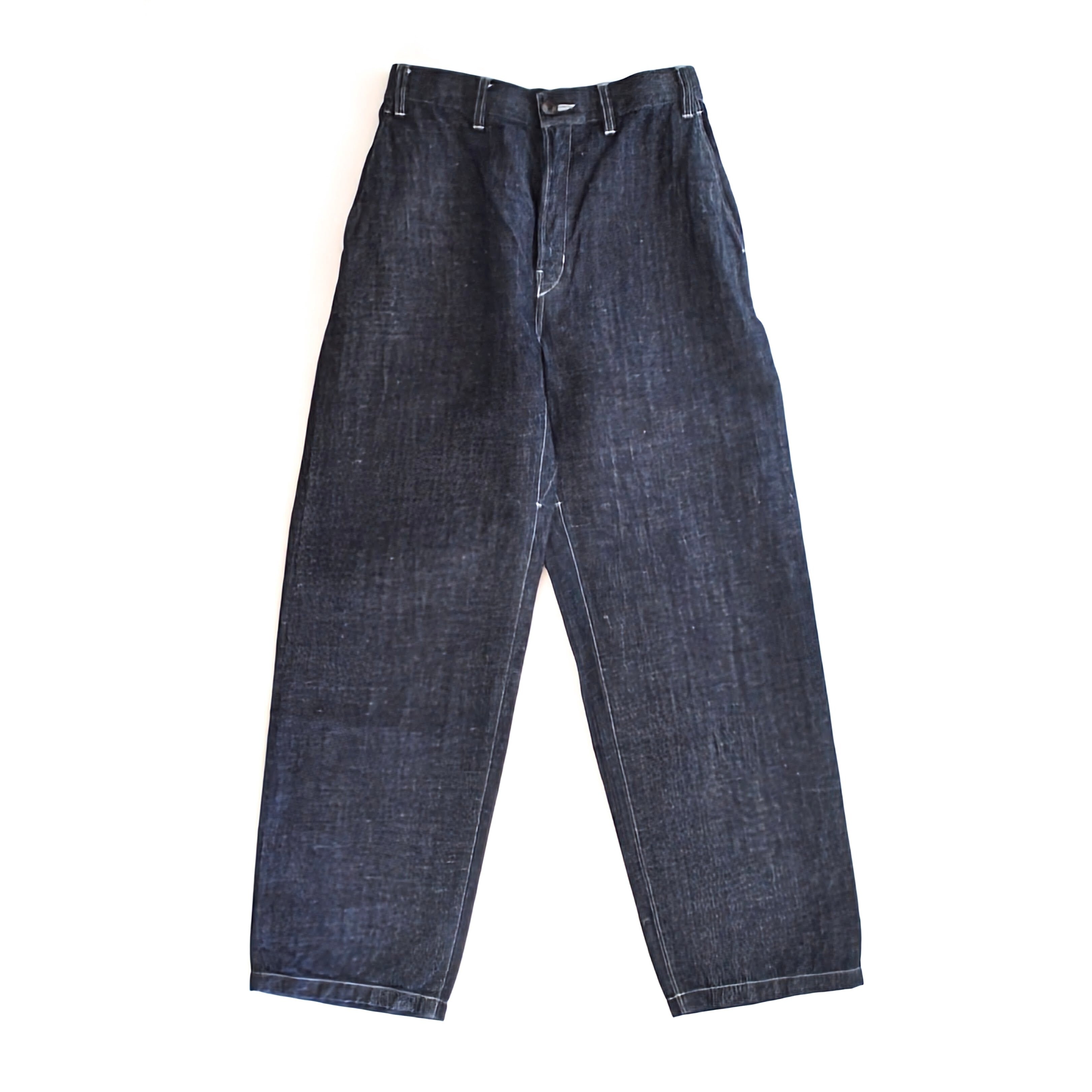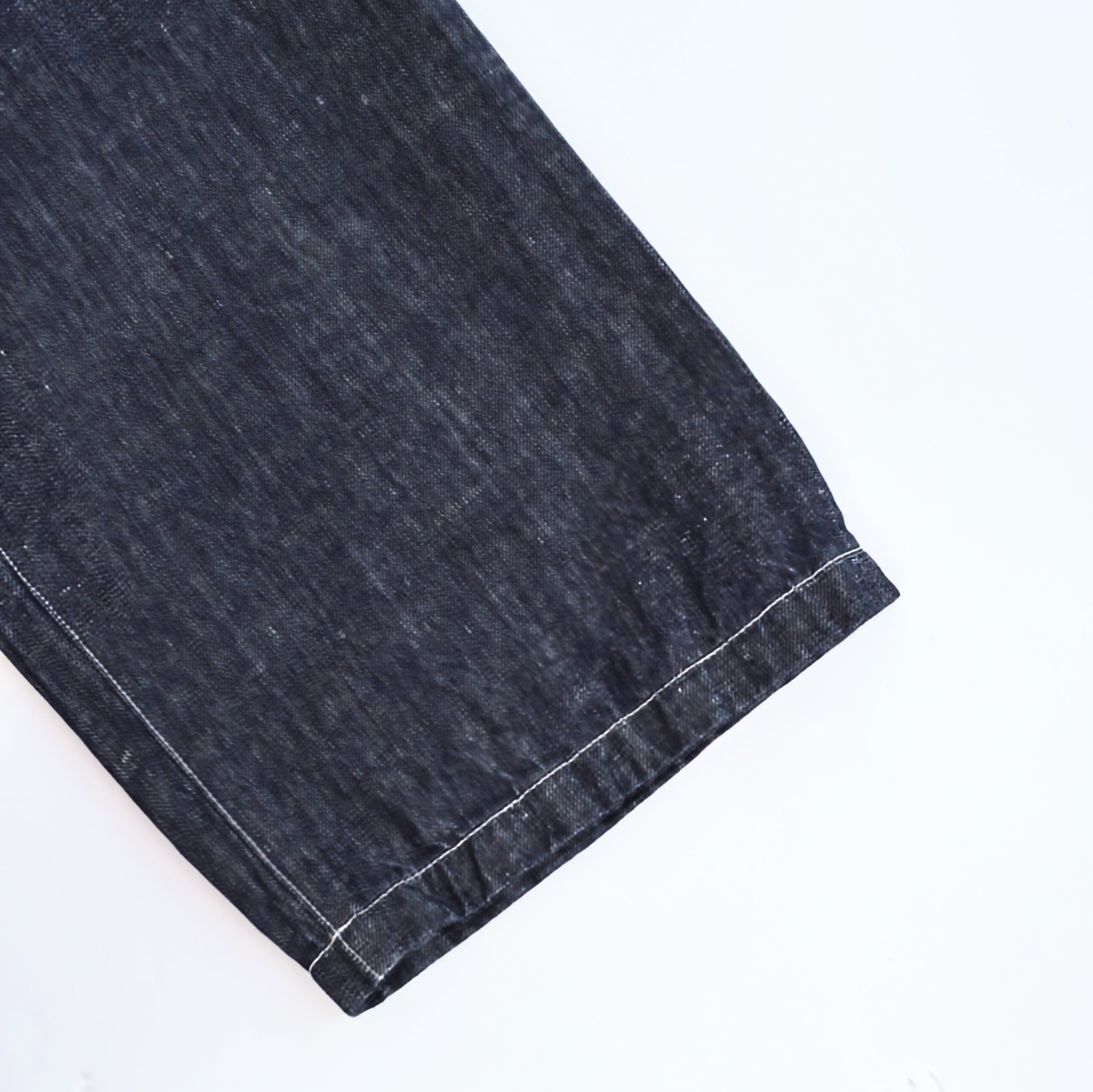 経糸にはオーガニックコットンを使用し、ロープ染色によって表面のみをインディゴで染め、糸の芯を白く残しています。緯糸には大麻を用いており、穿き込むほどにインディゴの色が薄く変化し、大麻も強度を保ちながら綿のようにしなやかに変化していきますので、長い時間をかけて風合いが深まっていく様子を楽しめる生地です。