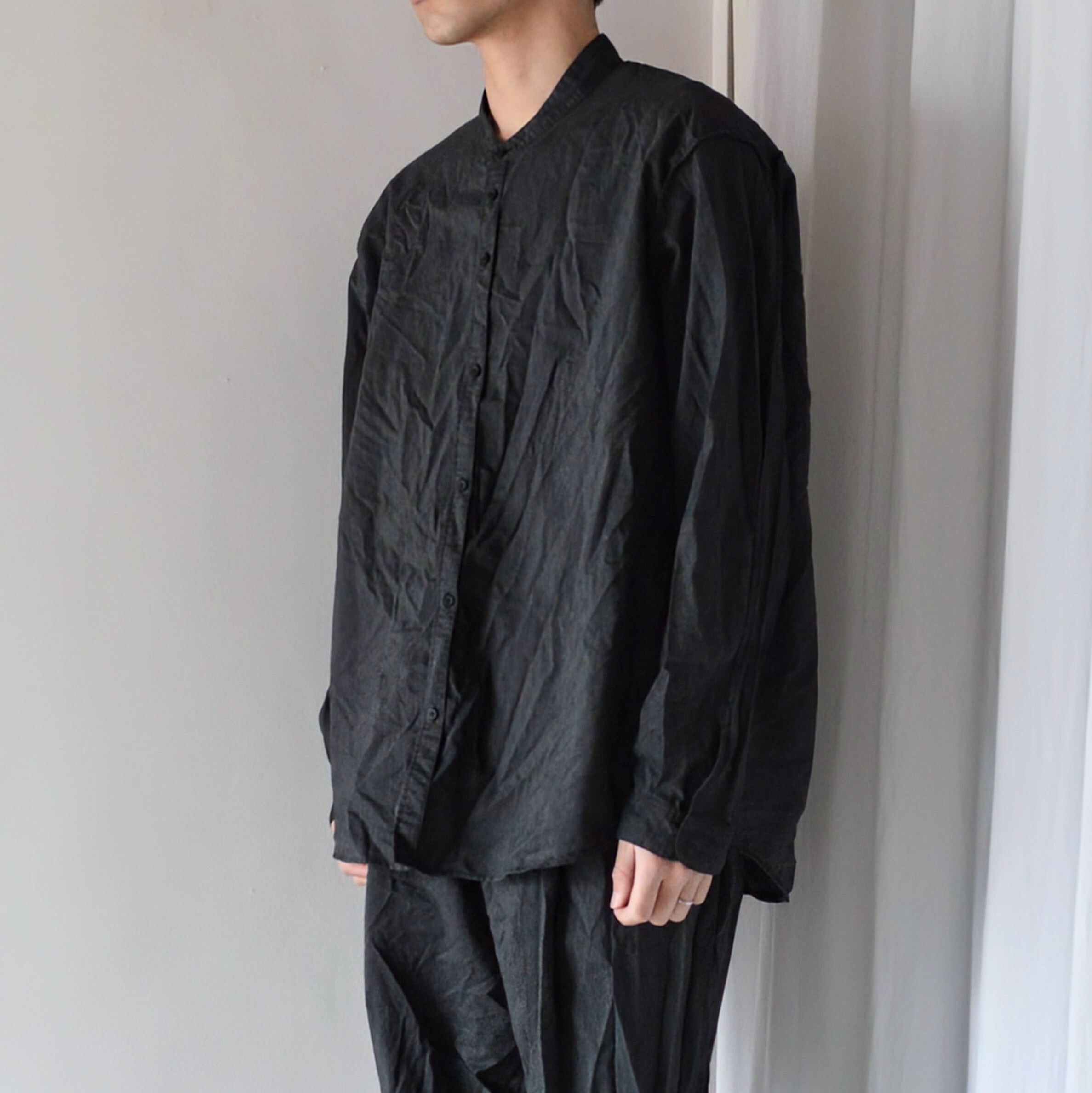 〈DDUD〉のブレンド・ポプリン/ ポリエステル・ガーメントダイシリーズから、スタンドカラーシャツ。