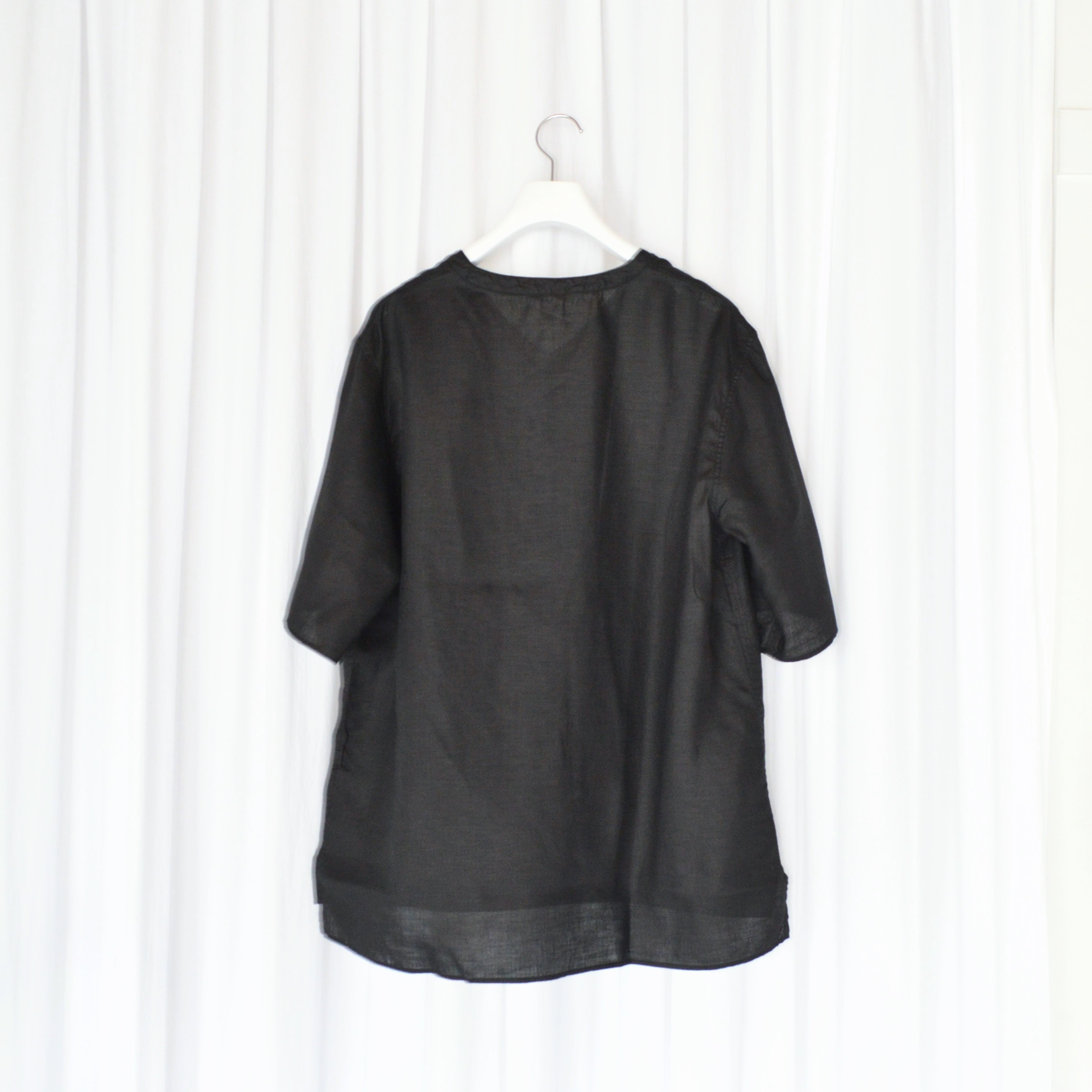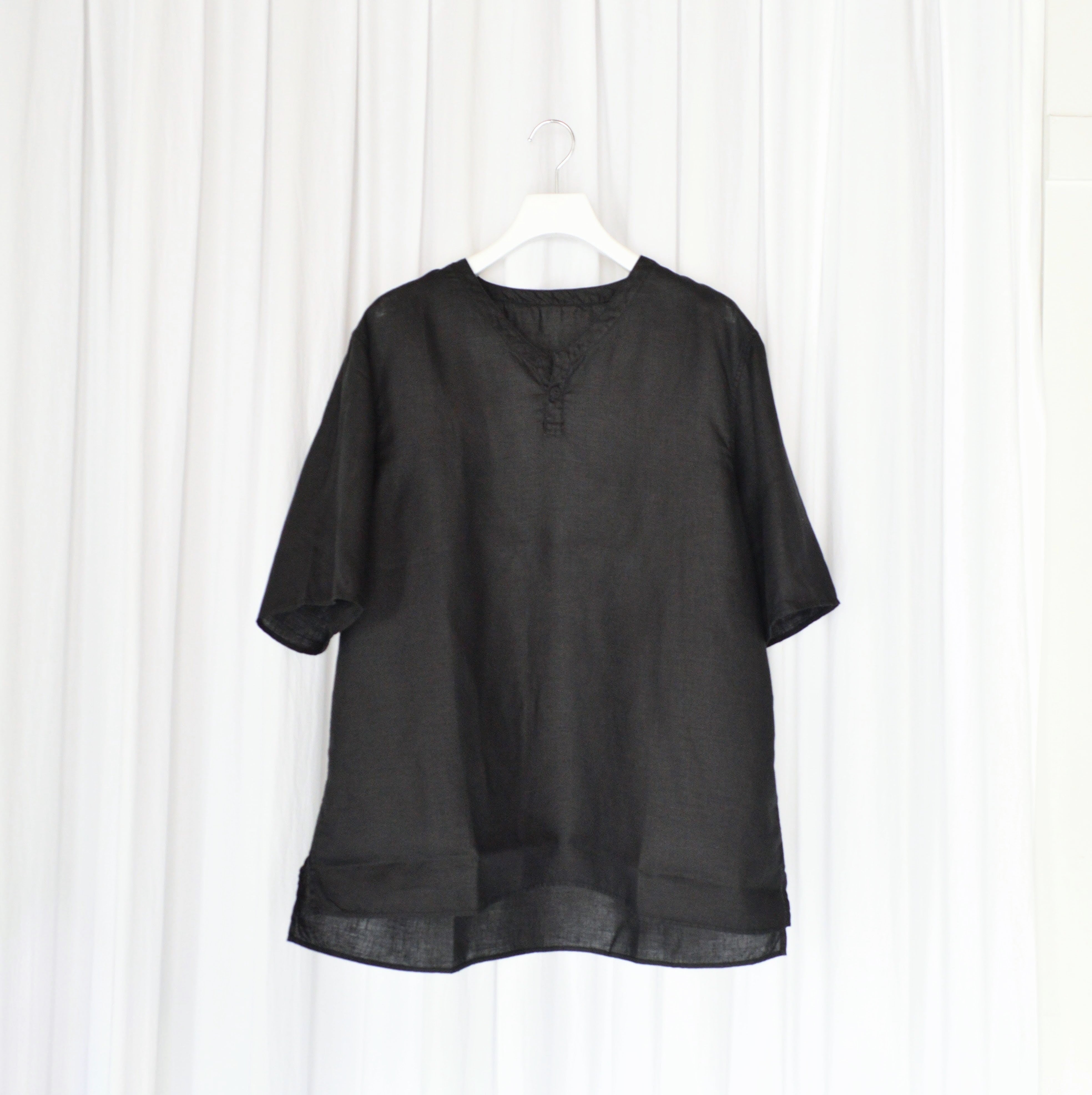 オーバーサイズのプルオーバーで、身体と生地の空間を多くとることで着ていないかのような解放感があります。V字にしたヘンリーネックに、あえて1つボタンにする事でシンプルなデザインが特徴です。肩にいせ込みを入れる事で肩周りの運動量を確保しています。又、ゆったりとしたシルエットの為、着脱がしやすいのも特徴的です。インド製のラクダの骨のボタンを用いて手縫いで付けています。