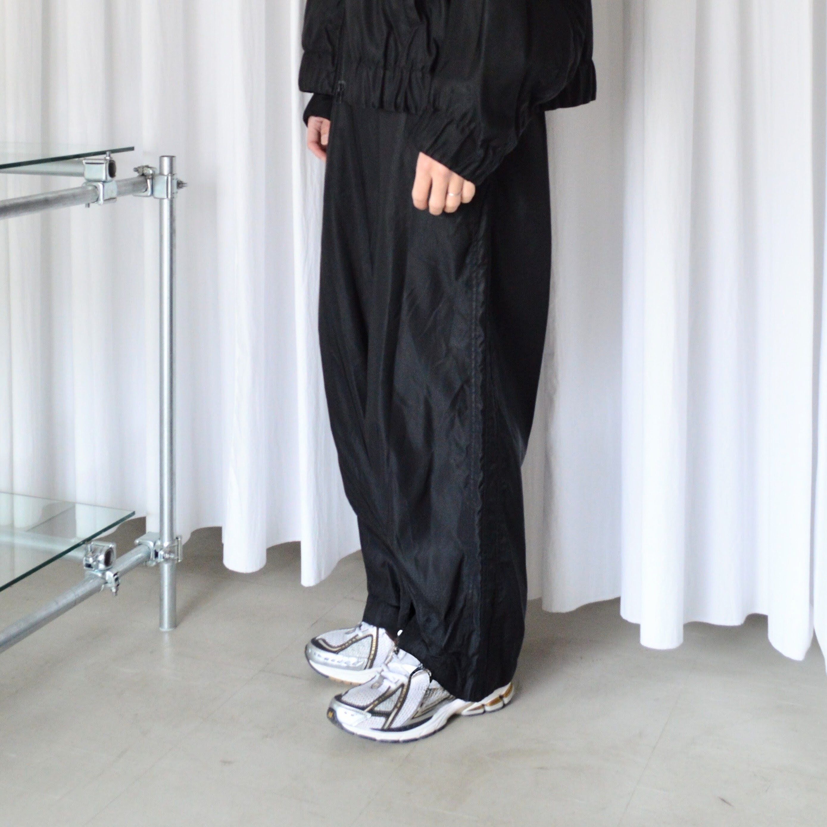 ストレートシルエットで光沢のあるナイロン生地と相まってスポーティな仕上がりです。
