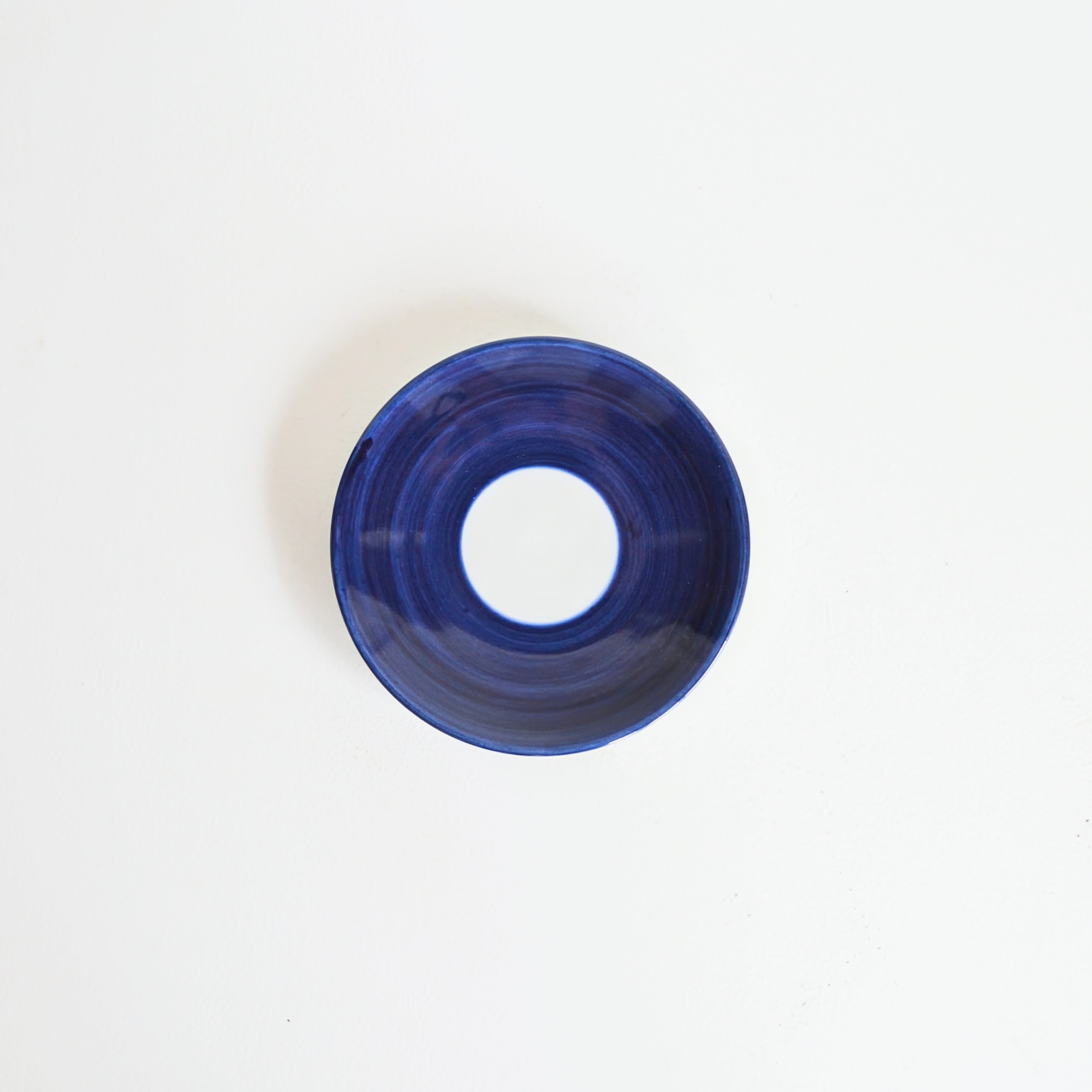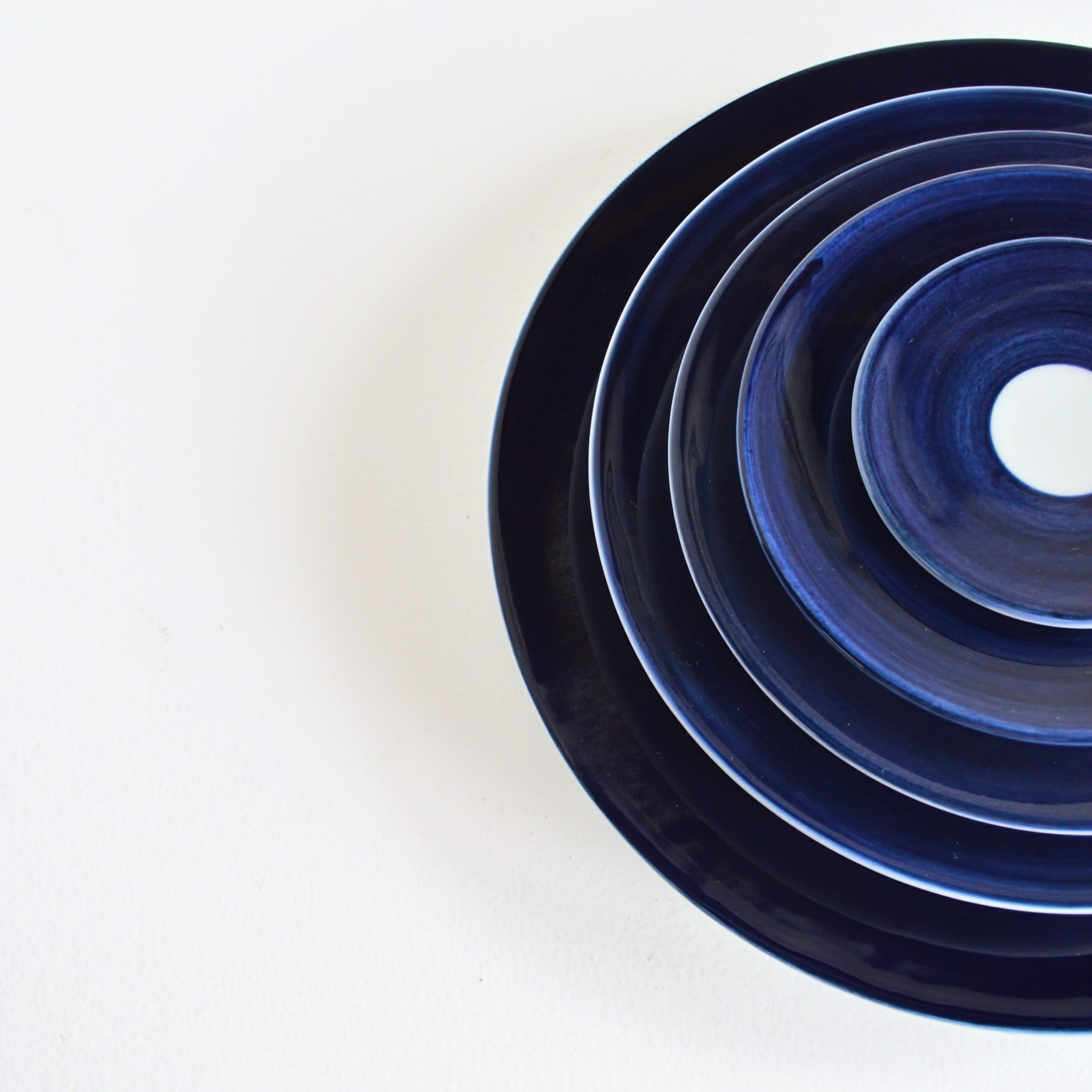 印象的な深みのある青い円は、”呉須”というコバルトを主成分とした顔料によるもので、釉薬をかけて焼くことで化学反応を起こし、藍色に発色します。
